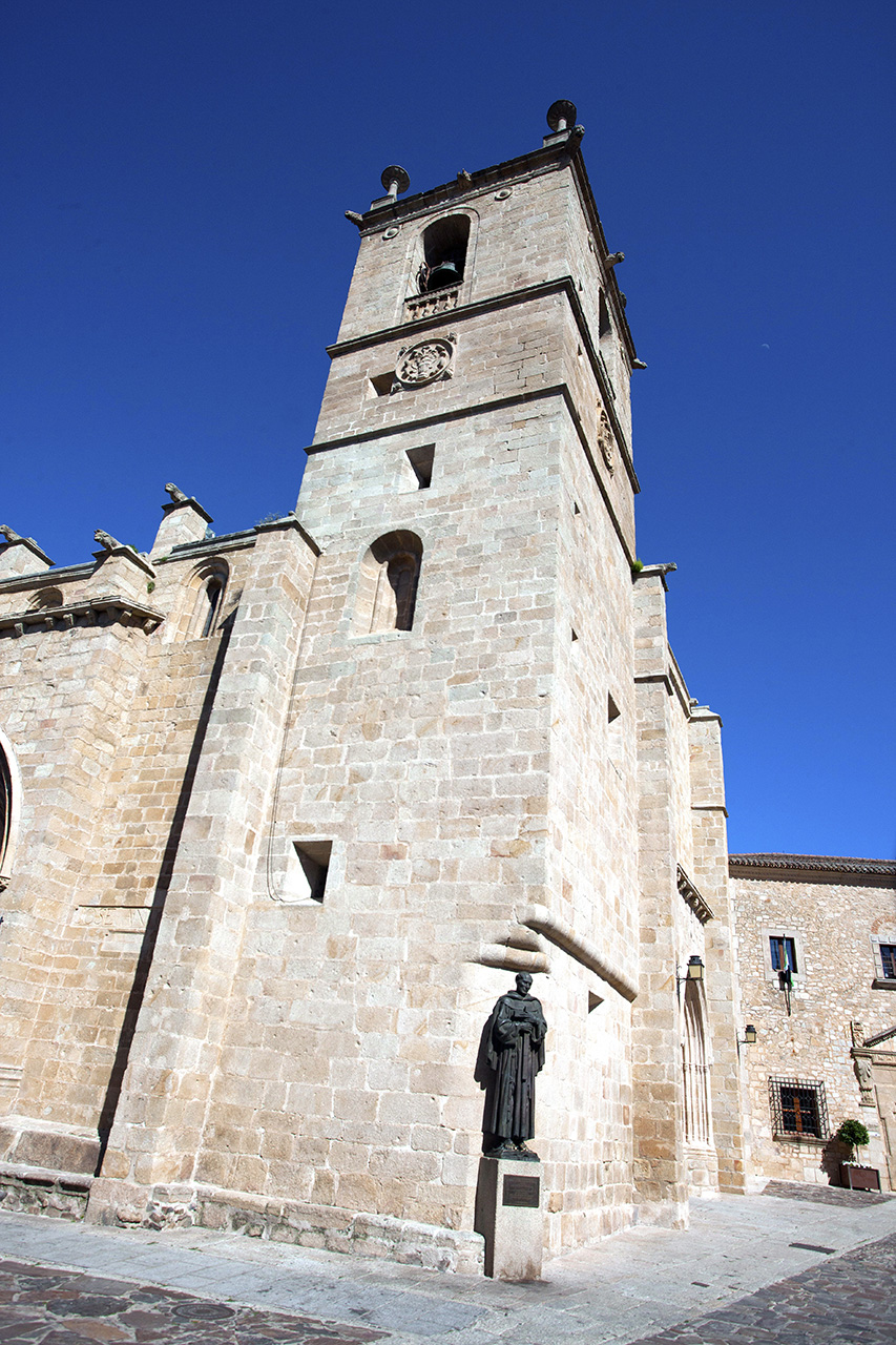 The outside is a typically sober example of Spanish medieval architecture. Initially it was Romanesque style, but now only some traces of its transition to Gothic style remain, and one can appreciate Renaissance features in the tower and the choir. In one of its corners, at ground level, there is a sculpture of San Pedro de Alcántara.