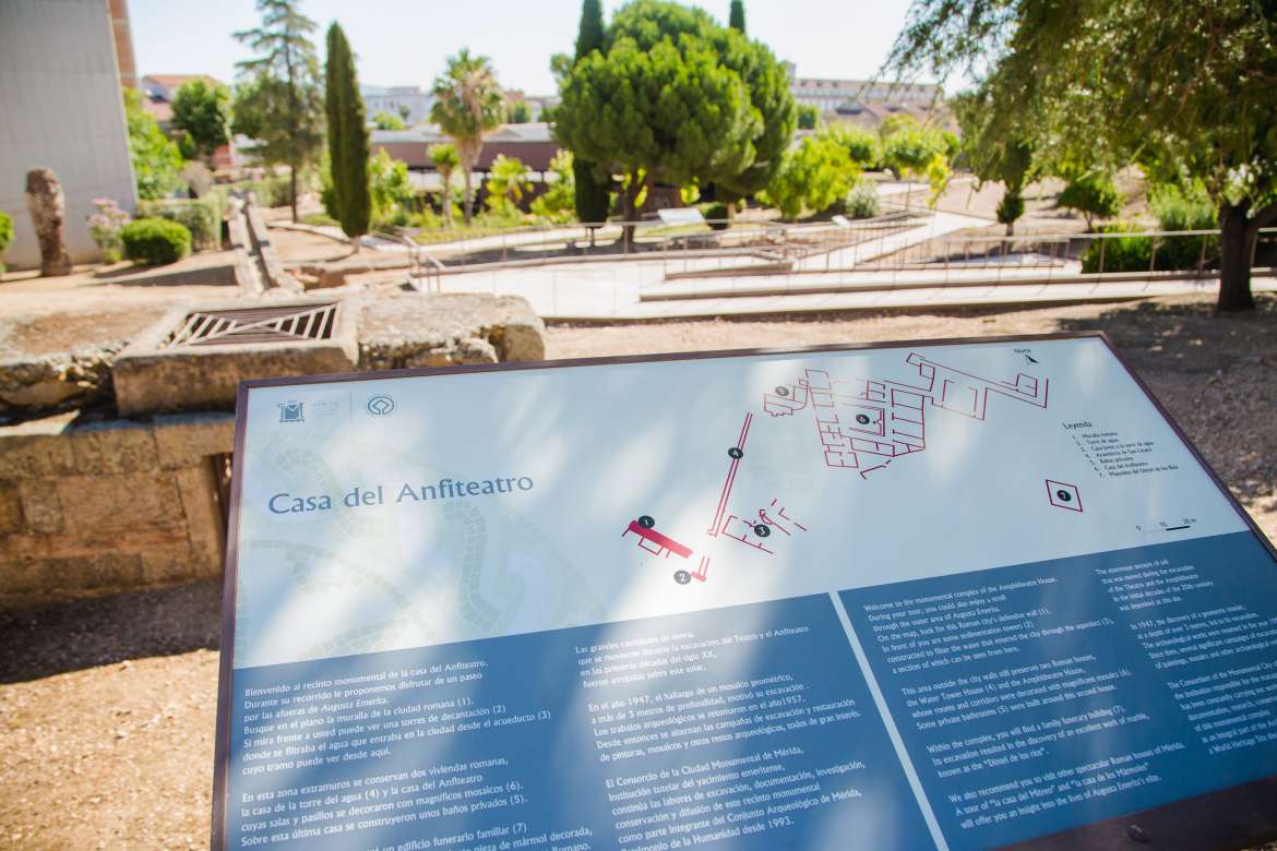 El recinto conocido como Casa del Anfiteatro ofrece la posibilidad de descubrir cómo eran las viviendas romanas. Destacan los 700 m2 de mosaicos, con representaciones de peces, como lenguados y meros, y escenas de vendimia. Pertenecía a un comerciante de aceite y se situaba extramuros de Emerita Augusta, muy cerca de la muralla de la ciudad.