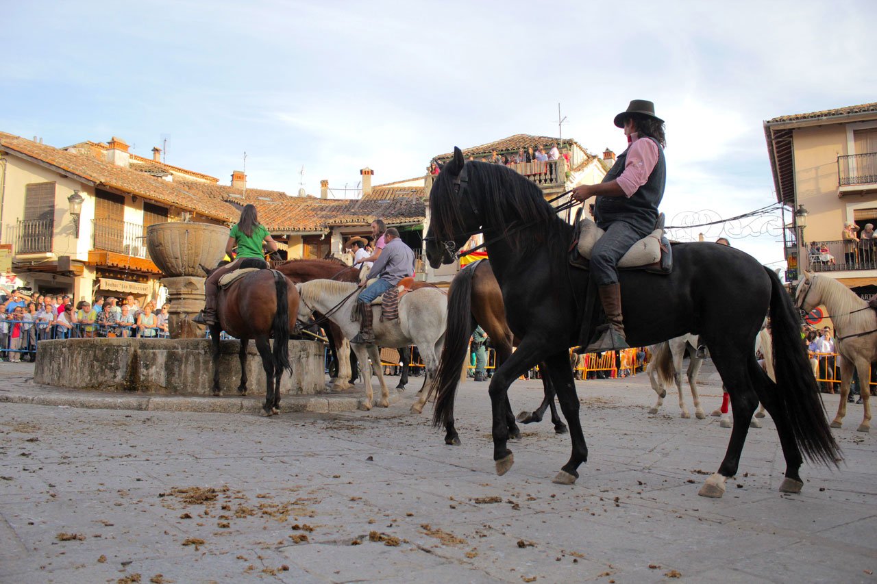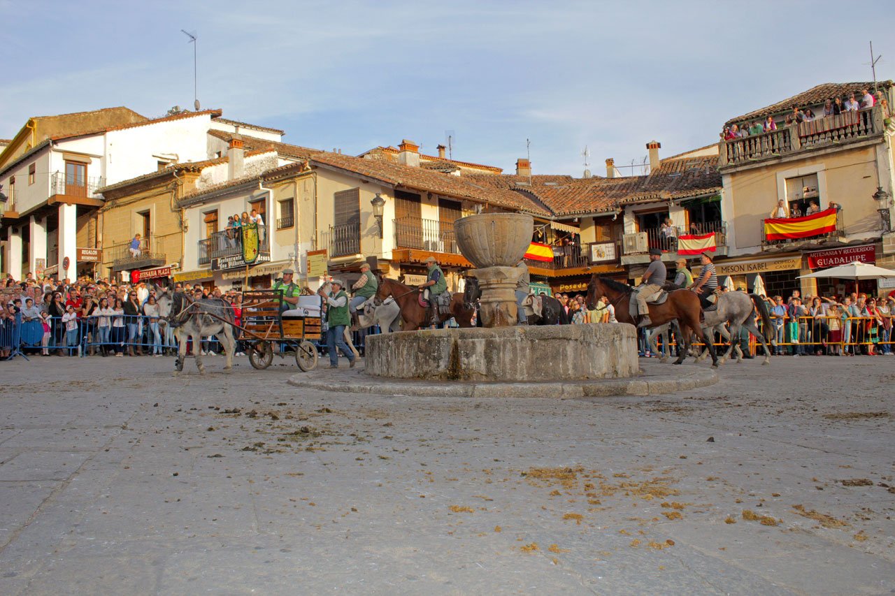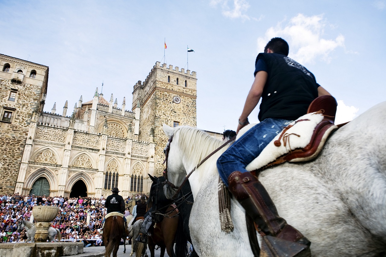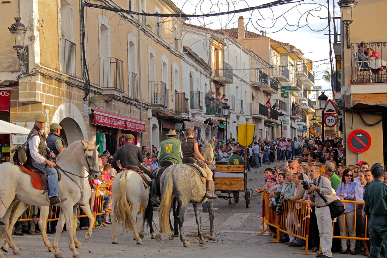 Es frente al Monasterio de Nuestra Señora de Guadalupe, a las cinco de la tarde, cuando el estruendo de miles de cascos sobre el empedrado de la plaza se apodera del ambiente y se lleva a cabo el acto de recibimiento de estos caballistas que han cabalgado durante horas, e incluso durante días, para celebrar esta festividad. Pero antes, por la mañana, se imponen bandas y medallas y se nombran los nuevos caballeros de la asociación, que saldrán en procesión hacia la basílica, donde se oficiará una misa en honor a la Reina de la Hispanidad.