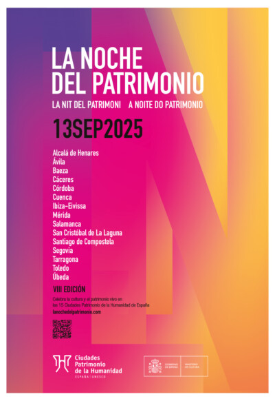 Las 15 ciudades Patrimonio de la Humanidad de España celebran el 13 de septiembre la Noche del Patrimonio con tres secciones comunes: ‘Abierto Patrimonio’ (apertura gratuita de espacios culturales, como museos, palacios, iglesias y edificios representativos), ‘Vive Patrimonio’ (espectáculos de pequeño formato de cultura y ocio) y ‘Escena Patrimonio’ (espectáculos que van de la danza contemporánea a la música y otras disciplinas).